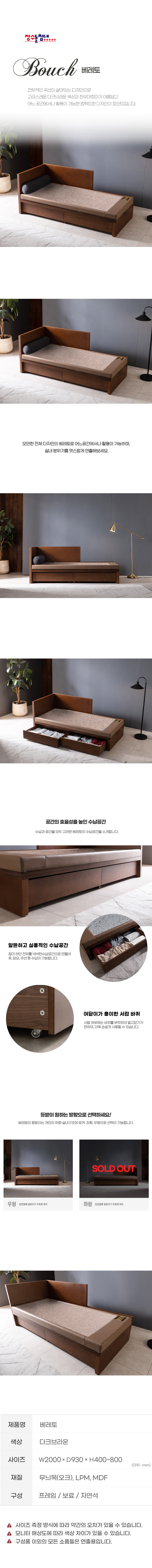 5.특징 : 고급스러운 질감의 천연오크무늬목 사용. 헤드, 등받이 가드가 있어 휴식을 취할 때 더욱 안정적인 분위기 연출, 하단에 알뜰하고 실용적인 수납공간 제공, 여닫이가 용이한 서랍 바퀴사용